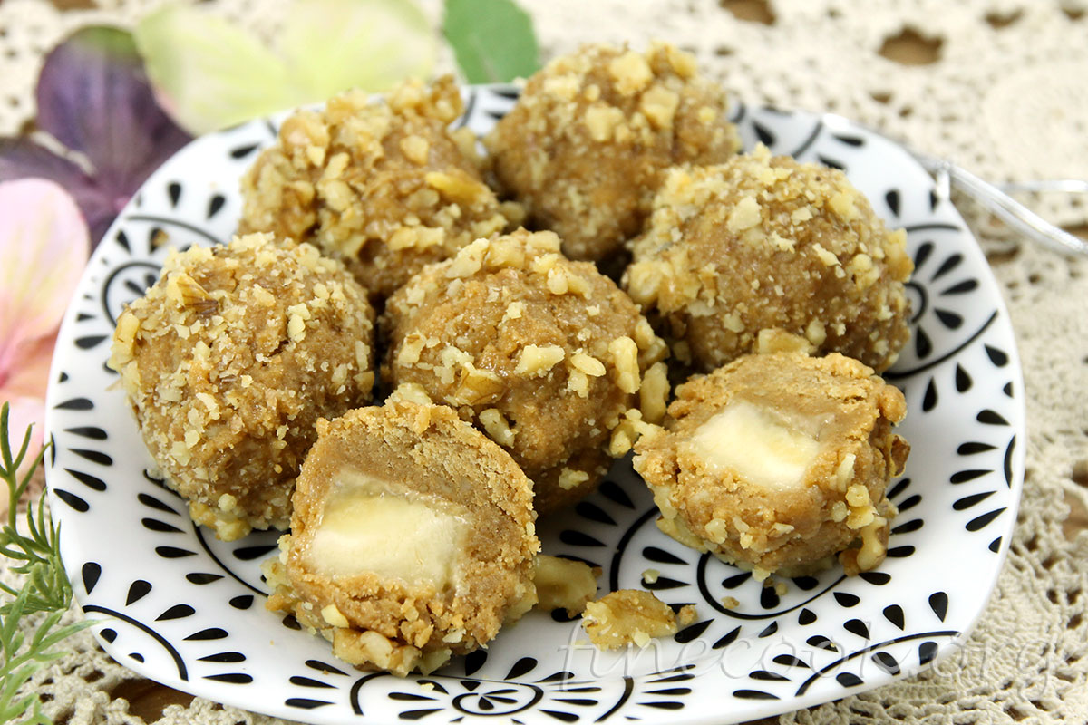 - Высыпать измельчённые орехи в тарелку и обвалять шарики в орехах. Если прилипают плохо, то можно смазать сгущёнкой, чтобы прилипало лучше.