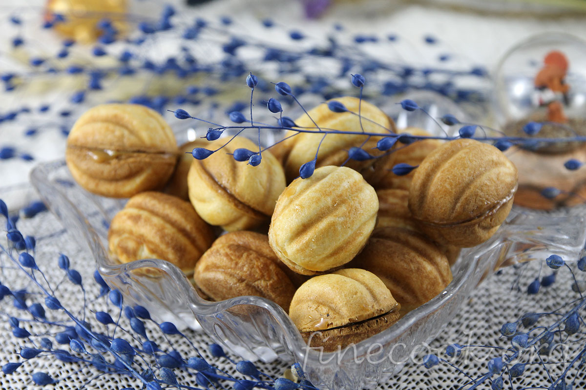 - Остывшие половинки орешков начинить сгущёнкой. Можно в середину положить настоящий орешек