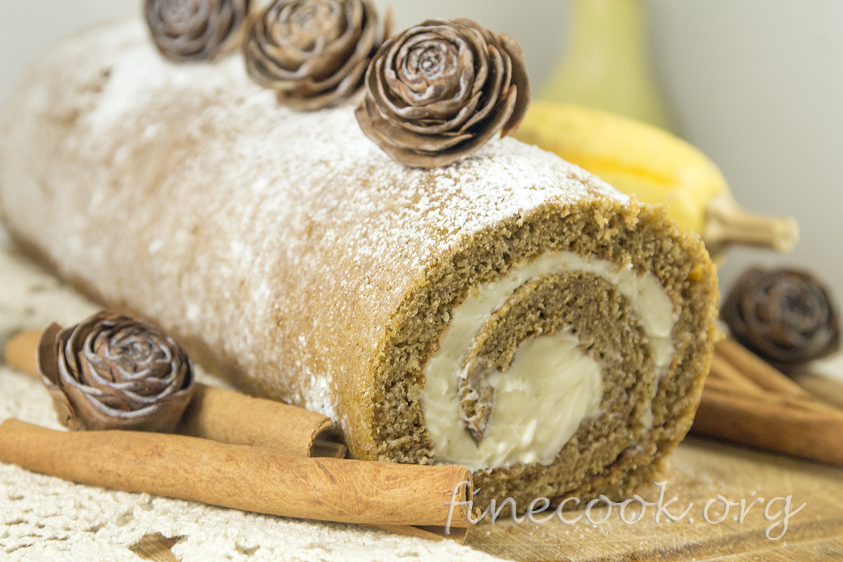 - Равномерно распределить крем по тесту и снова свернуть рулет