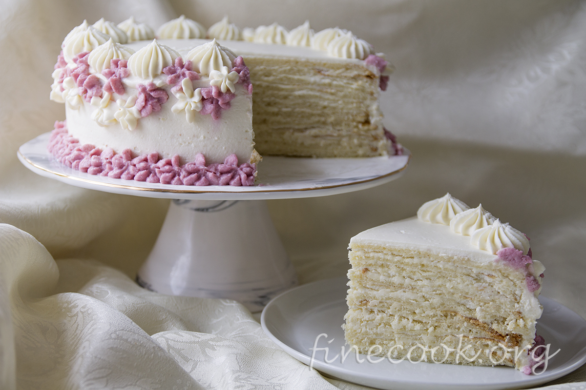 Торт представляет собой много много вкусных коржей, промазанных нежнейшим кремом из сливок и творога. Очень вкусно проложить между слоями ягоды - малину, вишню и другие, по сезону. Тот рецепт, что у меня, это не совсем классический вариант торта Молочная девочка. Тут в тесто добавлено сливочное масло и крем состоит не только из сливок и сахарной пудры, а ещё добавлен творог, так что получается менее жирным.
